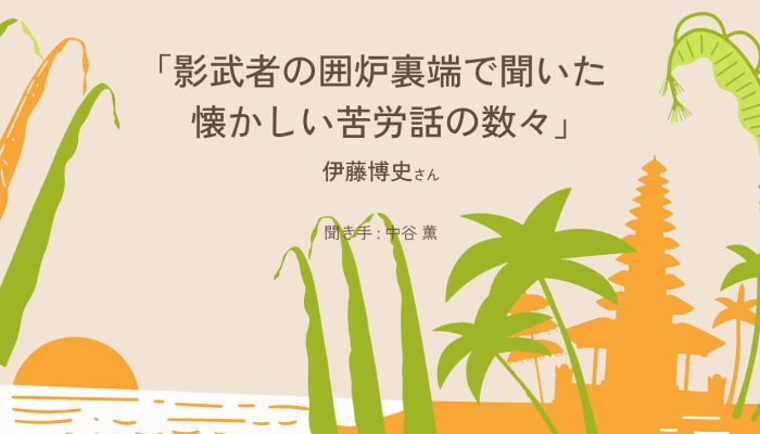 伊藤博史さんインタビュー Part3「影武者の囲炉裏端で聞いた懐かしい苦労話の数々」伊藤博史(いとう・ひろし)1990年からバリ島に在住し、1993年からジェゴグ発祥の地、ヌガラでのスアール・アグン定期公演を催行。ほかにも年末の特別公演、4チームによる ムバルンの実現、ヌガラの海岸での公演などをプロデュースして日本人ファンを増やした。スウェントラ氏亡き後の2021年には、コロナ禍でもスアール・アグンの演奏を届けようと、オンラインでの「応援ライブ」を開催している。https://www.youtube.com/watch?v=HWE-mddjk9o.聞き手 中谷薫.