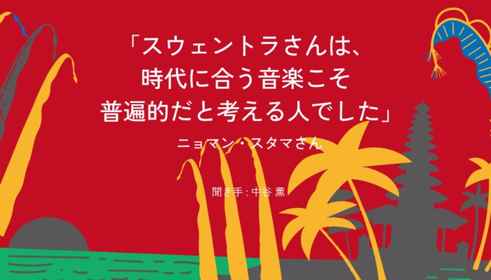 ニョマン・スタマさんインタビュー Part1「スウェントラさんは、時代に合う音楽こそ普遍的だと考える人でした」ニョマン・スタマ(I Nyoman Stama Sskar)バリ島・ジュンブラナ県出身。バリ国立芸術大学学士過程卒業後、故郷・ジュンブラナ県でガムランをはじめとするバリ伝統芸能の指導を開始。1989年、スウェントラ氏に誘われてスアール・アグンに入団。音楽監督を務める傍ら、スウェントラ氏と共に作曲活動も行った。2000年初頭に退団してからも、たびたびスアール・アグンの公演に参加。現在はバリ島在住日本人女性で構成される「グランタン(竹のガムラン)」グループ「スアール・ドゥイストリ」の