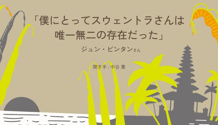 ジュン・ビンタンさんインタビュー Part2「僕にとってスウェントラさんは唯一無二の存在だったんだ」ジュン・ビンタン(Jun Bintang)ギャニャール生まれのロック・シンガー。ロックバンド「ビンタン(Bintang)」のシンガーとしてデビュー。同バンドは、日本語の「ありがとう、愛してる」を歌詞に使った「ありがとうマデ」の大ヒットで一躍バリ島で人気ナンバー1のバンドとなる。スアール・アグンとは、日本人アーティストの関将(Show Seki)プロデュースのバリ・アートフェスティバルで共演した。バンドの休止状態によるソロ活動のさらなる成功により、子供からお年寄りまで、バリ島では彼を知らない