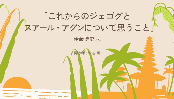 伊藤博史さんインタビュー Part4「これからのジェゴクとスアール・アグンについて思うこと」伊藤博史(いとう・ひろし)1990年からバリ島に在住し、1993年からジェゴグ発祥の地、ヌガラでのスアール・アグン定期公演を催行。ほかにも年末の特別公演、4チームによる ムバルンの実現、ヌガラの海岸での公演などをプロデュースして日本人ファンを増やした。スウェントラ氏亡き後の2021年には、コロナ禍でもスアール・アグンの演奏を届けようと、オンラインでの「応援ライブ」を開催している。https://www.youtube.com/watch?v=D86ZZ2jqoDs.聞き手