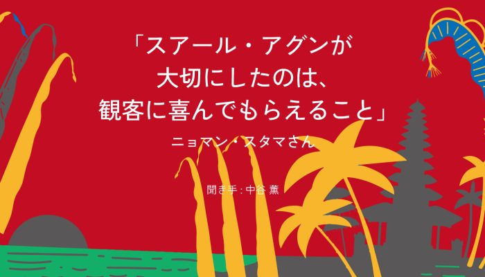 ニョマン・スタマさんインタビュー Part2「スアール・アグンが大切にしたのは、観客に喜んでもらえること」ニョマン・スタマ(I Nyoman Stama Sskar)バリ島・ジュンブラナ県出身。バリ国立芸術大学学士過程卒業後、故郷・ジュンブラナ県でガムランをはじめとするバリ伝統芸能の指導を開始。1989年、スウェントラ氏に誘われてスアール・アグンに入団。音楽監督を務める傍ら、スウェントラ氏と共に作曲活動も行った。2000年初頭に退団してからも、たびたびスアール・アグンの公演に参加。現在はバリ島在住日本人女性で構成される「グランタン(竹のガムラン)」グループ「スアール・ドゥイストリ」の指導
